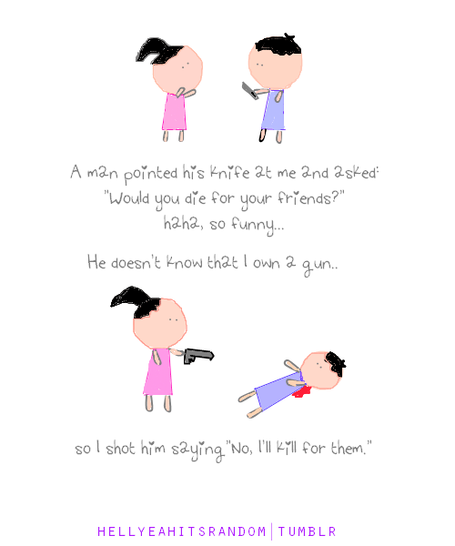 July 21, 2010August 28, 2014 sarasvvati hellyeahitsrandom: strong friendship♥ Yep yep! So funny!! “I’ll kill for them!!” 😀 Share this:Share Click to share on X (Opens in new window) X Click to share on Pinterest (Opens in new window) Pinterest Click to share on LinkedIn (Opens in new window) LinkedIn Like Loading... Related