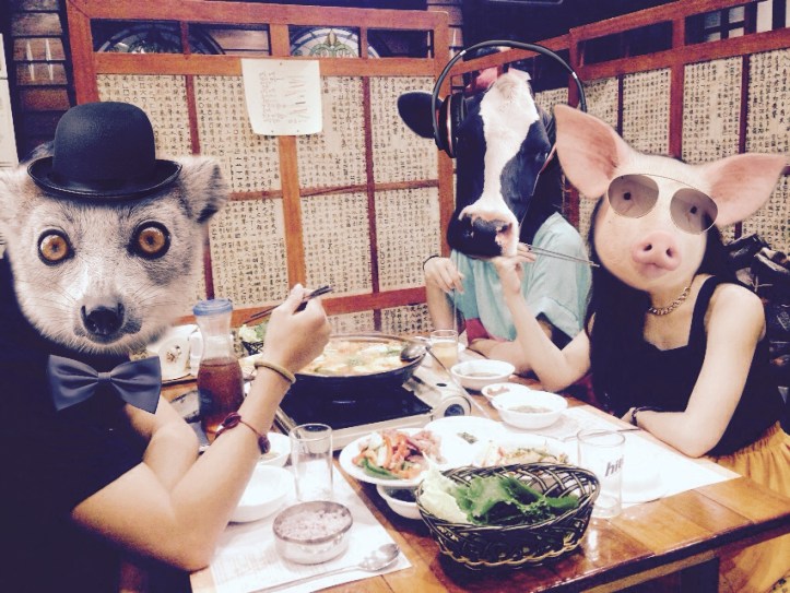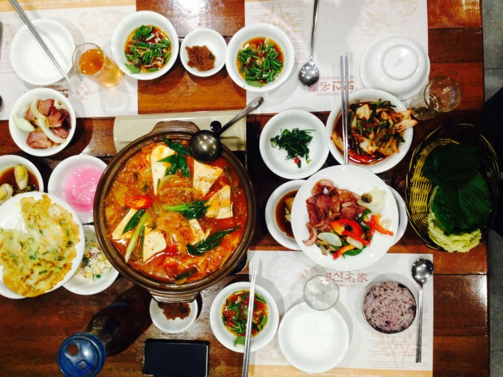 We had a tough time deciding what we were going to eat because everything in the menu looked yummy. At the end, we finally chose Kimchi Jeongol (a bigger portion of Kimchi Jigae) and Honje-ori Ssambap. Kimchi Jigae or Kimchi Jeongol or Kimchi Stew is the most common Korean stew made with fermented kimchi, pork-belly (but in Indonesia it’s usually replaced by beef since Indonesia is Muslim-dominated country), and tofu. Kimchi itself is a traditional fermented spicy-and-sour Korean side dish made of vegetables with a variety of seasonings. While Honje-ori Ssambap is smoke-roasted duck with Ssambap eating style. Ssambap is a country style Korean food which uses fresh vegetables to wrap the rice and the duck together. To eat Honje-ori Ssambap, we must first take the lettuce and the leaves, put the rice and the duck in the lettuce and leaves, put some sauce or wassabi in it, then wrap it together, and eat it with one big bite. Yums!